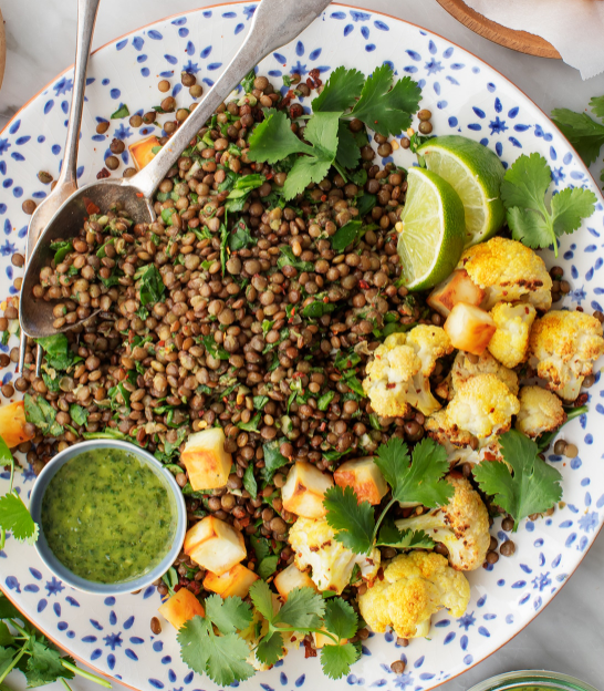 den karfiol in kleine röschen teilen, auf einem backblech verteilen und mit salz, pfeffer und olivenöl beträufeln. im rohr braten bis die röschen knusprig werden (ca 20 min), danach mit etwas kurkuma bestäuben. auf dem anderen blech den paneer-käse in würfel schneiden und ebenfalls salzen, pfeffern und mit olivenöl beträufeln. ungefähr nach 15 minuten wird auch er knusprig braun. spinat kleinhacken und zu den linsen mischen. salat, karfiol und paneer gemeinsam anrichten und mit dem restlichen dressing beträufeln.
